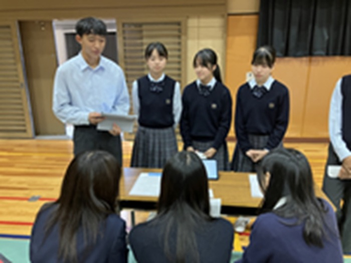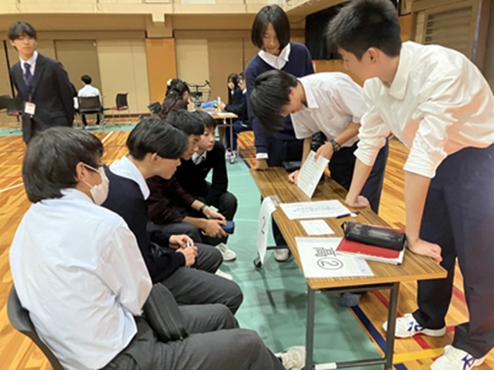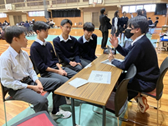このたび、その成果を発表する場として附属高校を訪れ、高校2年生との合同発表会を行いました。会場では、9年生がブースを設けてこれまでの探究を紹介し、高校生に体験してもらったり、質問や意見をもらったりしました。一方で高校生からも、自分たちが取り組む研究の内容を発表してもらい、社会問題を多角的に考える姿勢に大いに刺激を受けました。互いの学びを認め合い、高め合う時間となりました。