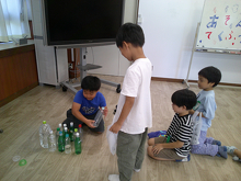 2年生が生活科「あそんでためしてくふうして」の学習に取り組み、いろいろなおもちゃをつくりました。つくったおもちゃで遊ぶために、1年生を招待してくれました。