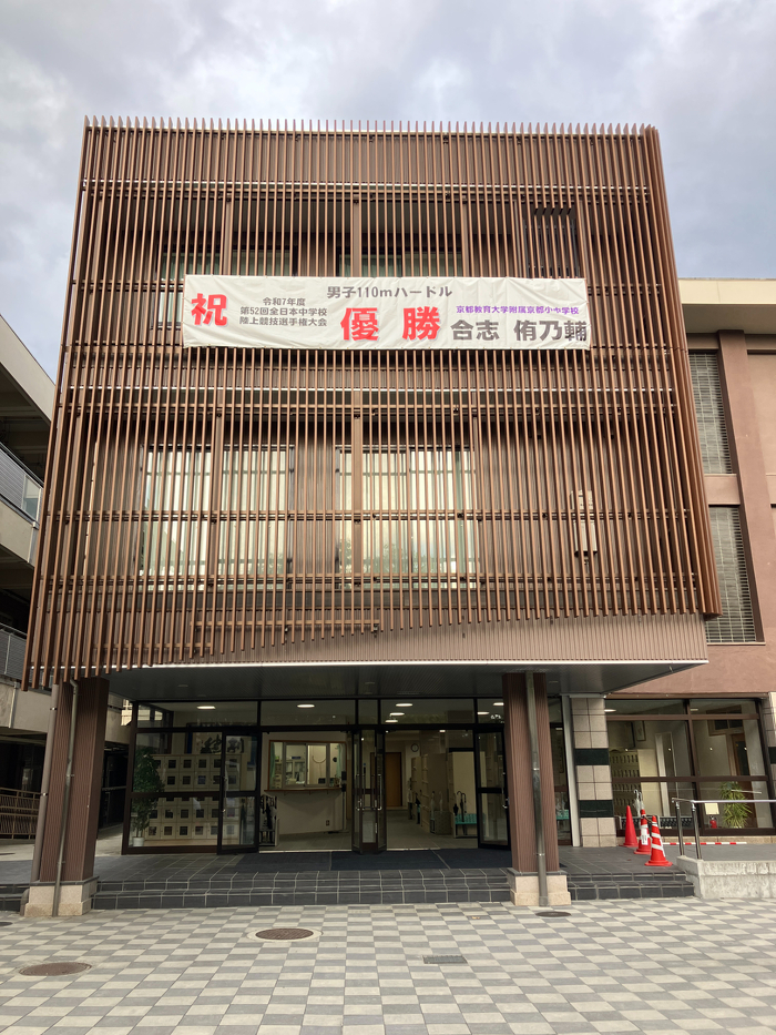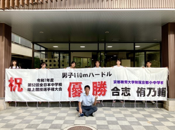 本校東エリアの校舎には、このたび全国大会で優勝を果たした陸上部9年生をたたえる横断幕が掲げられました。この横断幕は、本校の学友会(生徒会)の執行委員のメンバーが中心となって設置してくれたものです。彼は第78回京都市中学校総合体育大会110メートルハードルで優勝し、その後の京都府大会、近畿大会でも頂点に立ちました。そして全国中学校体育大会では、数々の強豪を相手に堂々とした走りを見せ、13秒60という記録で見事に優勝を果たしました。これまでの努力の積み重ねが実を結んだ輝かしい成果であり、仲間や教員、地域に大きな感動をもたらしました。校舎前に掲げられた横断幕は、その栄光をたたえるとともに、後に続く生徒たちへの励みとなっています。本校はこれからも、生徒一人ひとりの挑戦と成長を全力で応援してまいります。