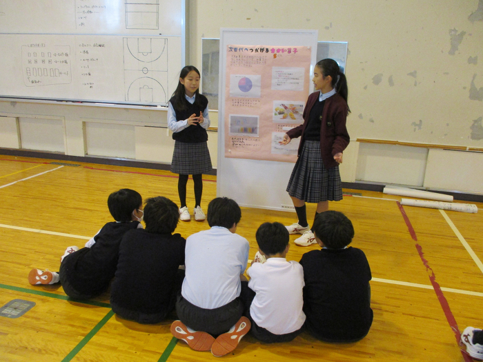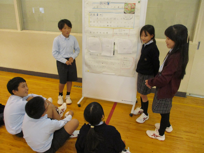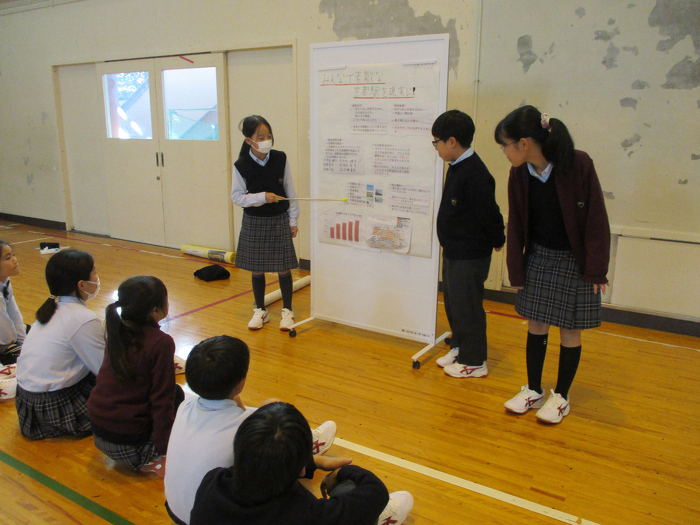 5年生の総合的な学習で進めている京都の町についての学習で、フィールドワークで収集した情報を整理して分析してポスターセッションを行いました。自分たちが考えたことを相手に向けて発信することで、さらに深めていきたい点や、新たな課題も見えてきて、さらに京都の未来について考えるきっかけとなりました。