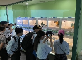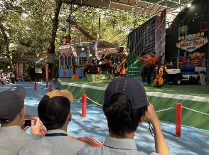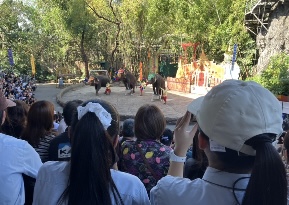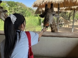 午前中はサファリパークを訪れ、見学研修を行いました。オランウータンやゾウのショーでは、ムエタイや民族舞踊が取り入れられており、動物と文化が結びついたタイ独自の表現に触れる機会となりました。また、卵の展示室では、さまざまな種類の卵や孵化の仕組みについて学び、孵化機や生まれたばかりの鳥を間近で観察しました。キリンへの餌やり体験もあり、自然や生命について考える時間となりました。