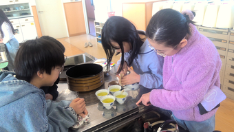 この日は家庭科室で、実際に急須を使ってお茶を入れる実習に挑戦しました。子どもたちは、まず器をあたためておくことや、お茶を少しずつ順番に注ぐことで味が均一になることなど、先生の説明を聞きながら丁寧に作業を進めていました。