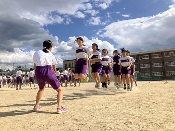 紫翔祭に向けて、9年生は伝統の種目である大縄跳びの練習に励んでいます。大縄跳びは女子90秒、男子90秒、そして男女混合120秒の合計回数を競う競技で、毎年最も熱く盛り上がる場面のひとつです。限られた時間で記録を伸ばすために、生徒たちは朝の授業が始まる前や昼休みを使い、息を合わせて繰り返し挑戦しています。大縄を回す手に力を込める生徒、タイミングをとるために声を掛け合う生徒、失敗してもすぐに立ち直り再び挑戦する姿に、学年全体の団結とエネルギーが感じられます。また、特別支援学級であるD組の生徒たちも団旗や学級旗を手に応援し、仲間の頑張りを後押ししてくれています。練習の場には一体感と熱気があふれ、本番に向けて気持ちが一層高まっています。紫翔祭当日、9年生の全力と絆がどのような記録を生み出すのか、期待が膨らみます。