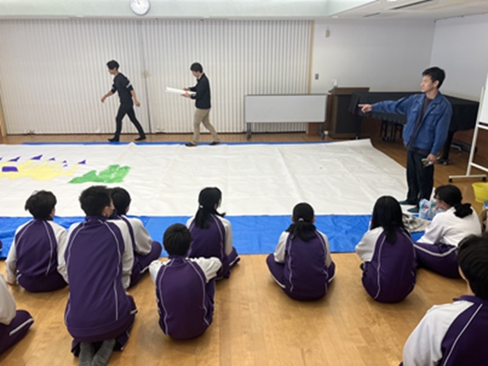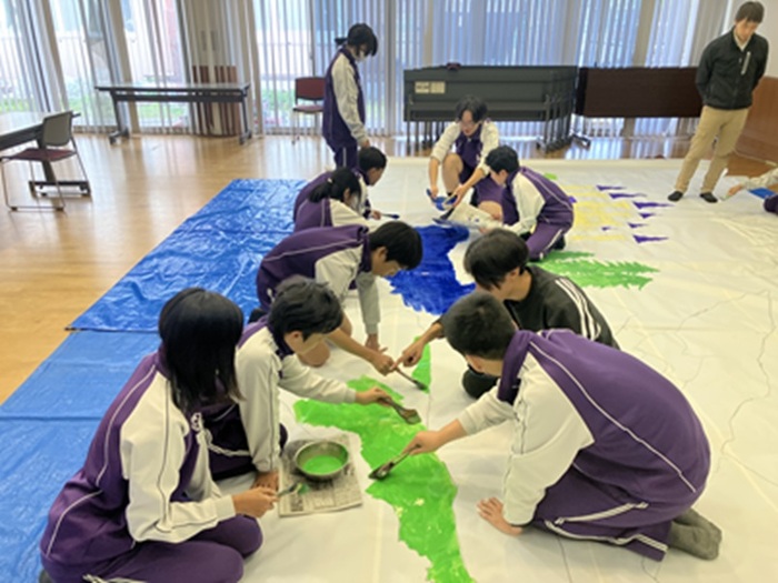 作業の中では、9年生が中心となって後輩に声をかけたり、道具の使い方を教えたりと、頼もしい姿が見られました。7・8年生もその姿に励まされ、協力して作業を進めていました。美術科の先生の指導のもと、一人ひとりが自分の役割を果たしながら、みんなで一つの作品を仕上げていく過程そのものが学びになっています。