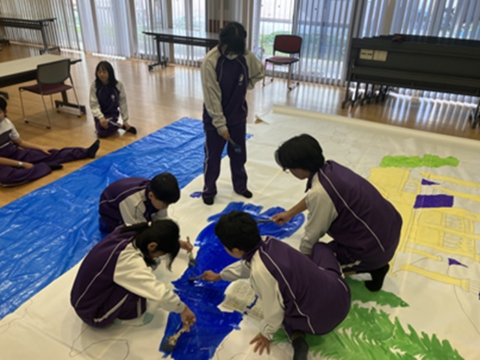 7・8・9年のD組が合同で披露する「D組劇」に向けた準備が進んでいます。今日は3学年が集まり、美術の先生のサポートのもと、背景の色塗りに取り組みました。ランチルームいっぱいに広げられた大きな紙を目の前に、子どもたちはその迫力に思わず声を上げました。月や城、空などの部分を分担しながら、丁寧に色を重ねていきます。