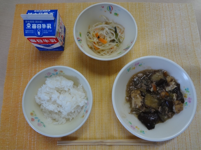 9月20日(水)の献立は、ごはん、牛乳、麻婆茄子、春雨の中華風サラダでした。