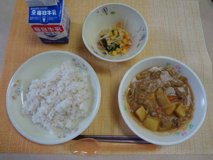 9月28日の献立は、麦ごはん、牛乳、豆乳風味のポークカレー、もやしとわかめのサラダでした。