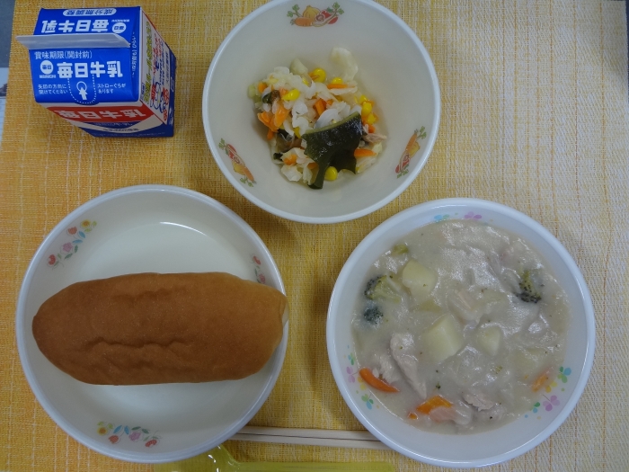 9月12日(火)の献立は、コッペパン、牛乳、豆乳風味のクリームシチュー、キャベツとコーンのサラダでした。本校では、できるだけ多くの子どもが食物アレルギーを気にせずに、みんなと同じ給食を食べることが出来るように工夫しています。今日のシチューもルウから給食室で作っていますが、小麦粉、牛乳、バターは使用せずに代わりに米粉、豆乳、マーガリンを使用しています。