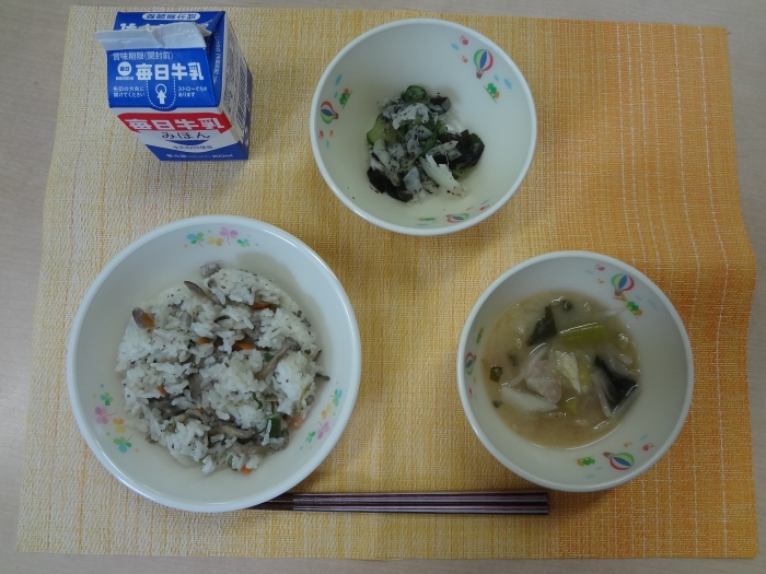 9月15日(金)の献立は、どんどろけごはん、牛乳、しそ風味和え、もやしとベーコンのみそ汁でした。